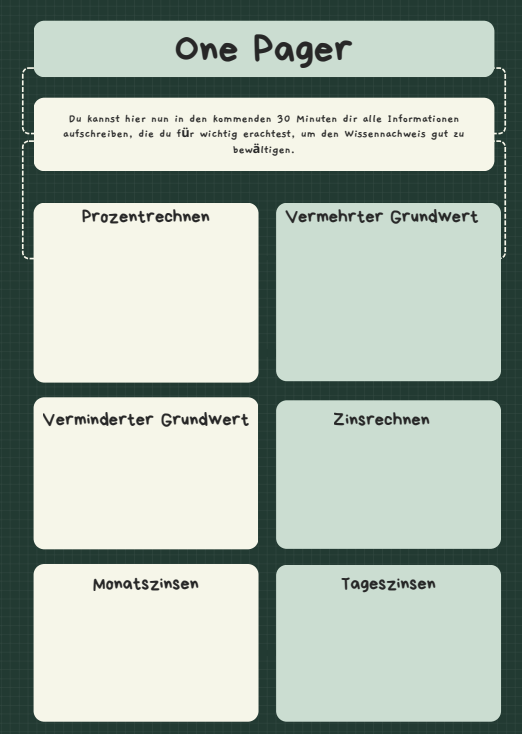 Die Schüler:innen haben 30 Minuten Zeit vor dem Wissensnachweis ihren individuellen One-Pager fertigzustellen und dann als externe Festplatte zu nutzen. Somit wird wieder Arbeitsspeicher frei.